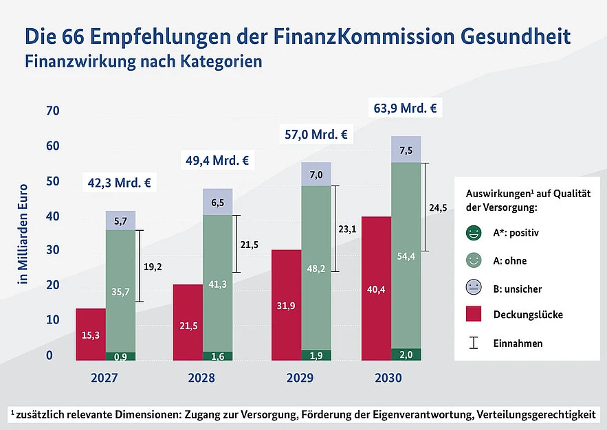 Die Kommission beziffert die bestehende Finanzlücke der GKV auf über 15 Milliarden Euro im Jahr 2027. Bis 2030 wird dieser Betrag Schritt für Schritt auf über 40 Milliarden Euro ansteigen. Die dann zu zahlenden Krankenkassenbeiträge kann sich kein Versicherter mehr leisten.